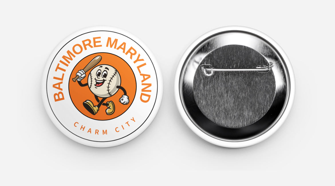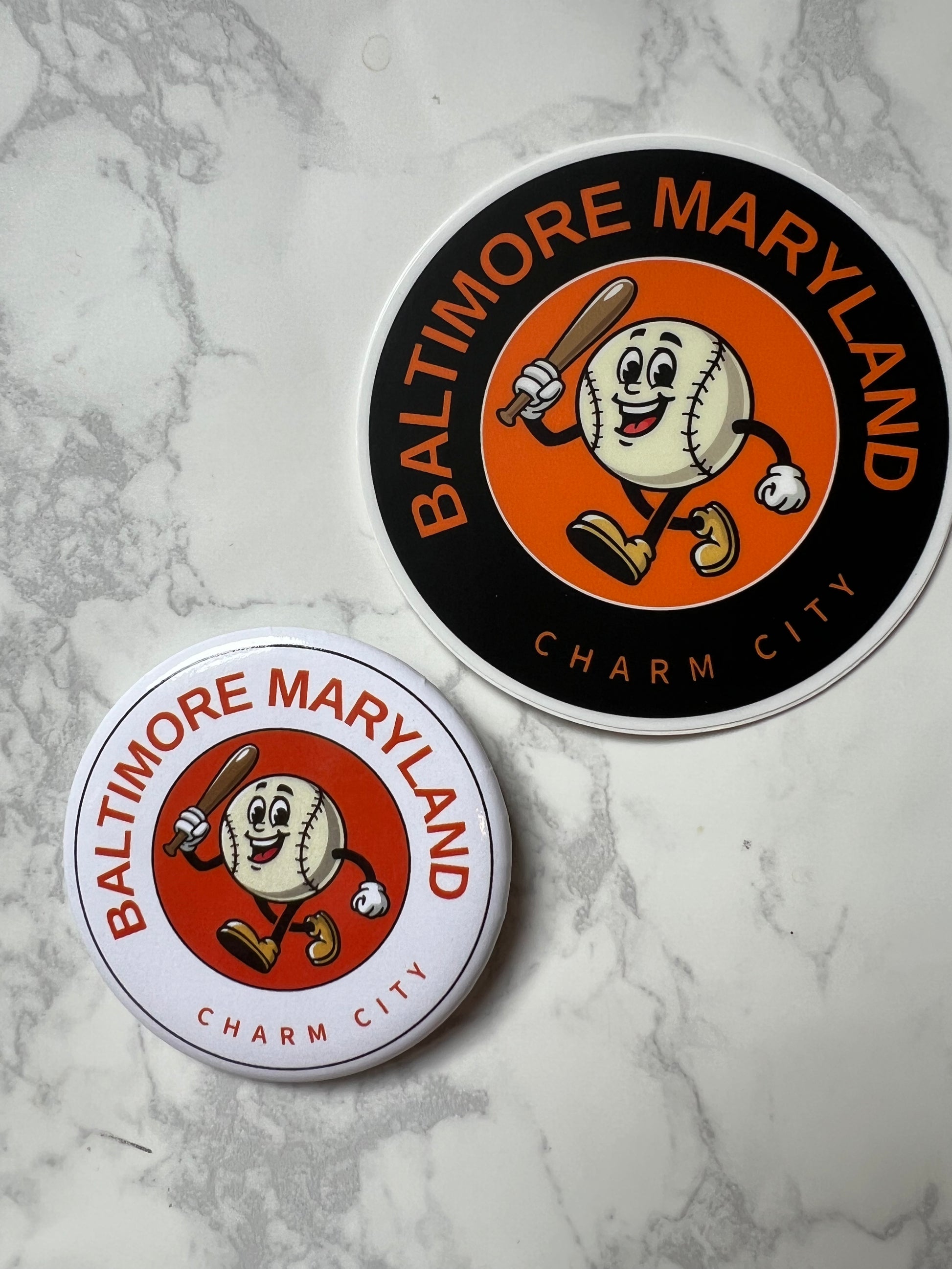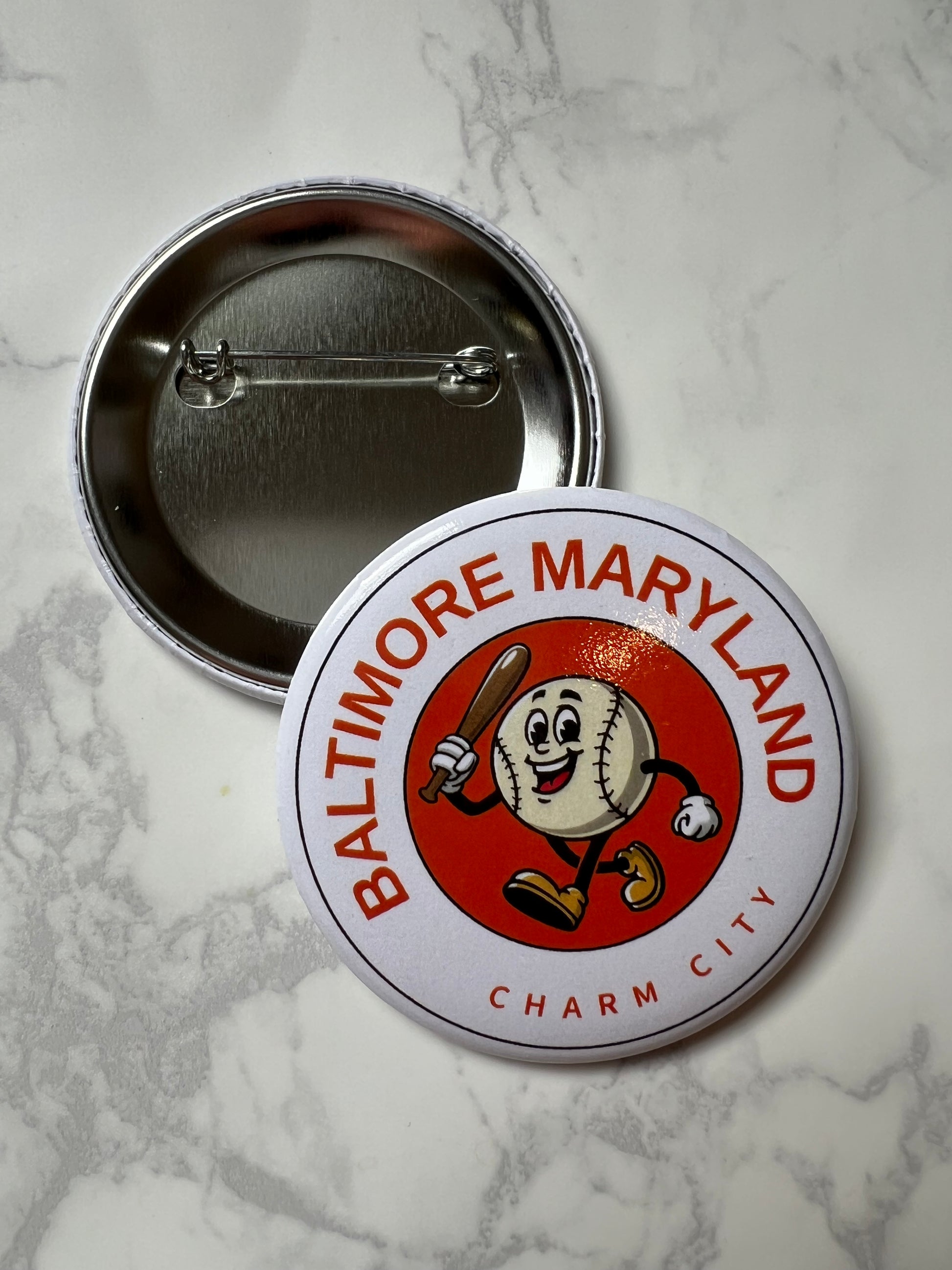 Slam a home run with our Baltimore Baseball Button! This 2.25x2.25 inch button is the ultimate accessory for any baseball fan. Show off your love for the game with this playful and quirky button that packs a punch (or should we say, a hit) of fun!