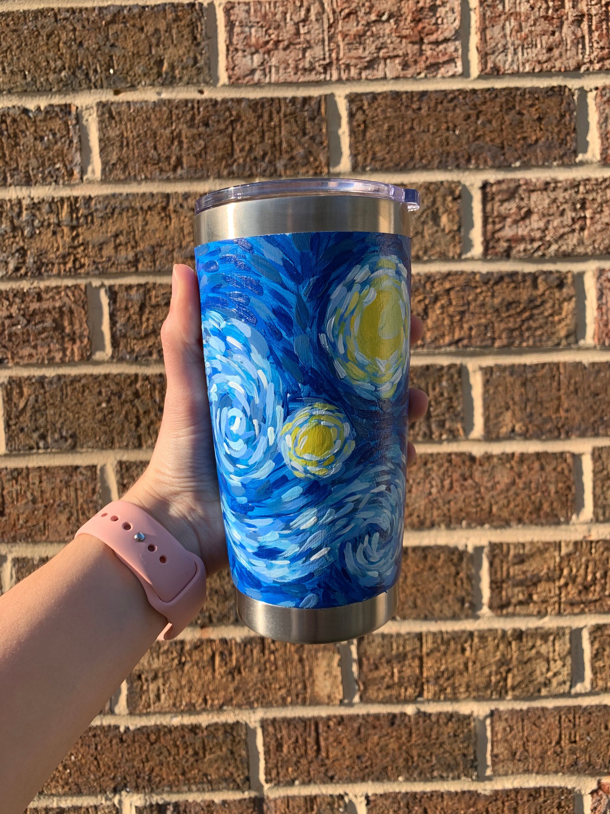 This custom hand painted tumbler is sure to get attention and keep your drink hot (or cold your choice). The tumbler is made of metal and keeps drinks cold for up to 12 hours. Comes with a closable lid and straw! Paint is sealed but should be HAND WASHED ONLY. Choose what you want painted on your tumbler, maybe you love Starry Night or you want a totally different hand painted scene! Contact me and we can work it out!