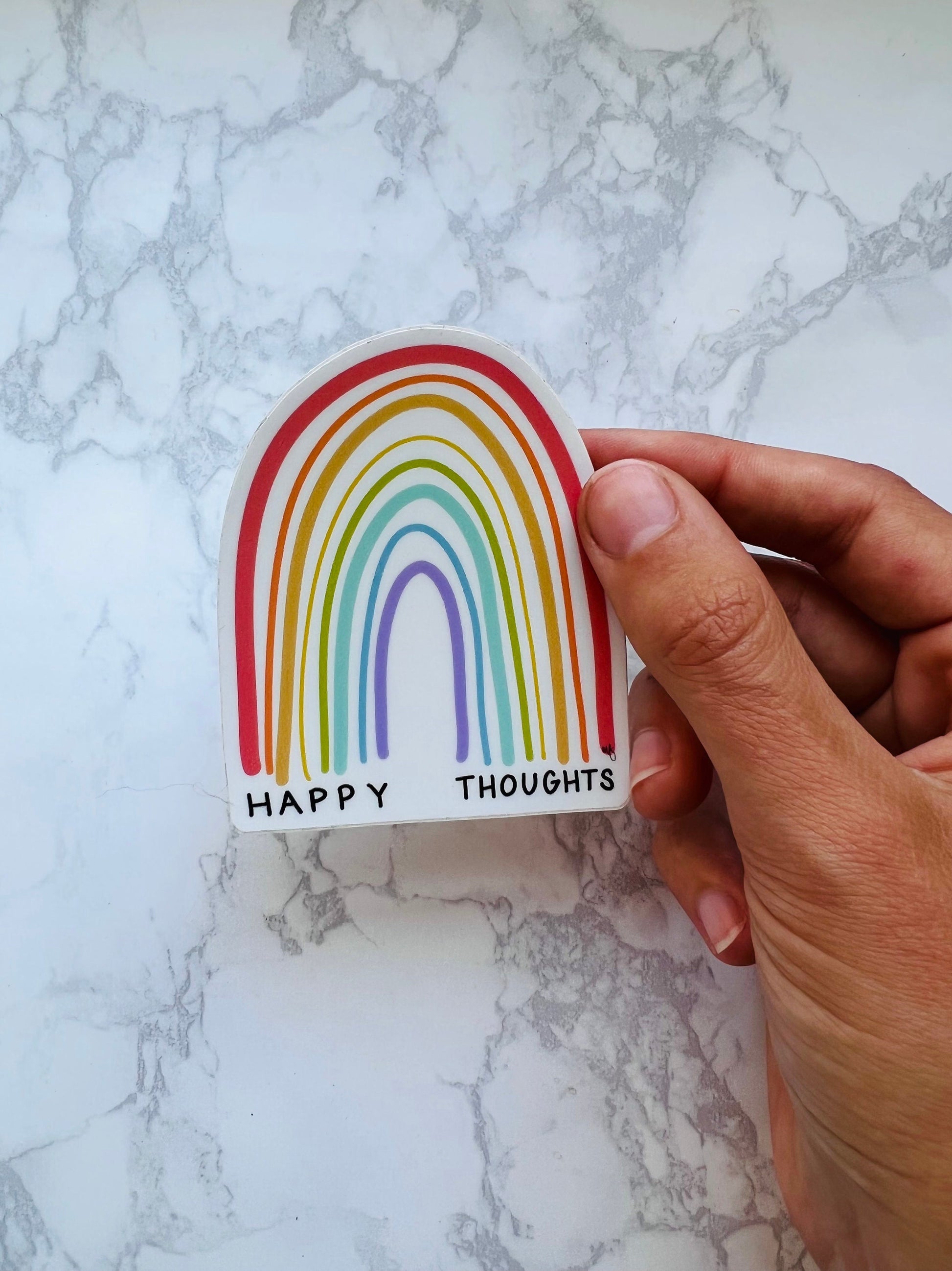 Add a splash of happiness to your day with our Happy Thoughts Rainbow Sticker! This 3x2in colorful sticker will brighten up any surface and bring a smile to your face. Spread positivity and joy with this playful addition to your sticker collection!