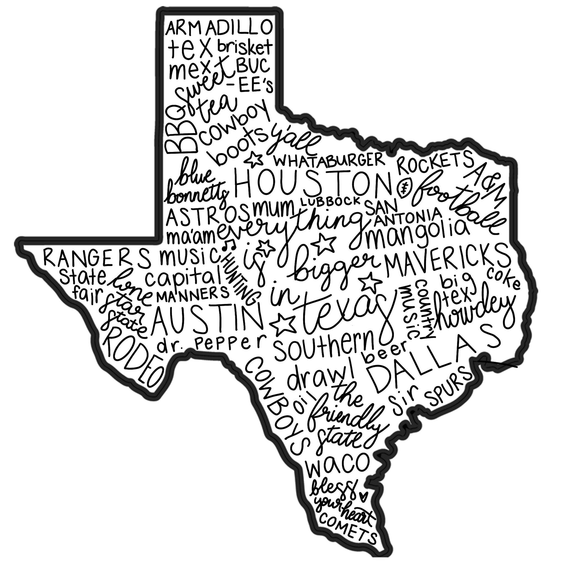 This Texas State Print is an original handmade digital print. It is a DIGITAL DOWNLOAD ONLY but would look great printed out in your office, college dorm or home living room! This piece features some of the most well-known Texas icons, locations, historical moments and traditions.